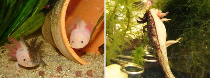Axolotl มีได้หลายสี ตั้งแต่สีชมพู (เผือก) เหลือง ไปจนถึงสีดำ