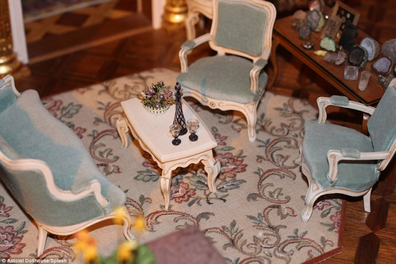 รูปนี้มองทีแรกอาจจะนึกว่าเป็นห้องในคฤหาสน์ หรือห้องฟังเพลงในโรงแรมห้าดาวแห่งใดแห่งหนึ่ง ความจริง มันคือห้องจิ๋วในบ้านตุ๊กตาหลังแพงที่สุดในโลก ข้างบนนี้ เห็นเฟอร์นิเจอร์และการตกแต่งแต่ละอย่าง ก็คงกลืนน้ำลายเอื๊อกกัน แล้วบอกว่า...เข้าใจแล้วว่าทำไมมันแพง เป็นของเล่นเฉพาะตัวของมหาเศรษฐินีแก่ๆเท่านั้น