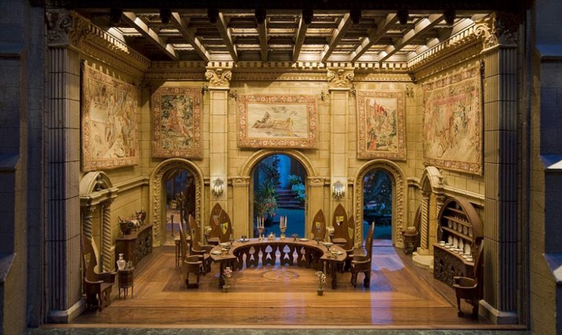 ห้องจัดเลี้ยงอาหารสำหรับแขกของคฤหาสน์ รายรอบแขวนด้วยทาเพสตรี หรือผ้าทอมือเป็นภาพงามต่างๆ สำหรับประดับผนัง มักจะเป็นภาพเหตุการณ์ เหมือนภาพวาด ไม่ใช่ทอเป็นลายอย่างทอผ้า ทาเพสตรีที่เห็นทอเด้วยมือสำหรับปราสาทจิ๋วหลังนี้โดยเฉพาะ ภาพที่ทอก็ย่อส่วนลงไปให้เข้ากับพื้นที่