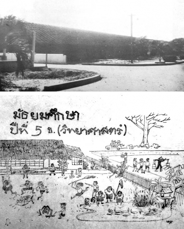นี่ไปค้นหนังสือรุ่นมา ภาพโรงเรียนที่เป็นเรือนจากมีตามที่เห็น แต่ก็คงจะพอได้ไอเดียจากการ์ตูนฝีมือผมข้างล่างที่อยู่ในเล่มเดียวกันนั้น ว่าบรรยากาศเป็นเช่นไร