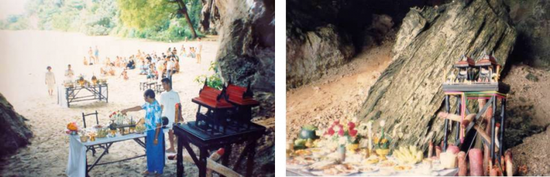 หลังจากนั้น ผมกับบิ๊กหมงก็ขึ้นรถตู้คู่ชีพ เอ้อ บิ๊กหมงก็คู่ชีพด้วยครับ เตรียมพลาสติกซีเมนต์สำเร็จรูปไปพร้อม กะไปถึงก็จะตั้งศาลแบบให้มั่นคงรวดเร็ว ที่ไม่ใช้ปูนซีเมนต์ธรรมดาเพราะต้องรอเป็นวันกว่ามันจะแห้งแข็งแรง ครั้นไปถึงก็ลงเรือของโรงแรม ให้ลูกเรือพาไปจอดหน้าถ้ำพอดี