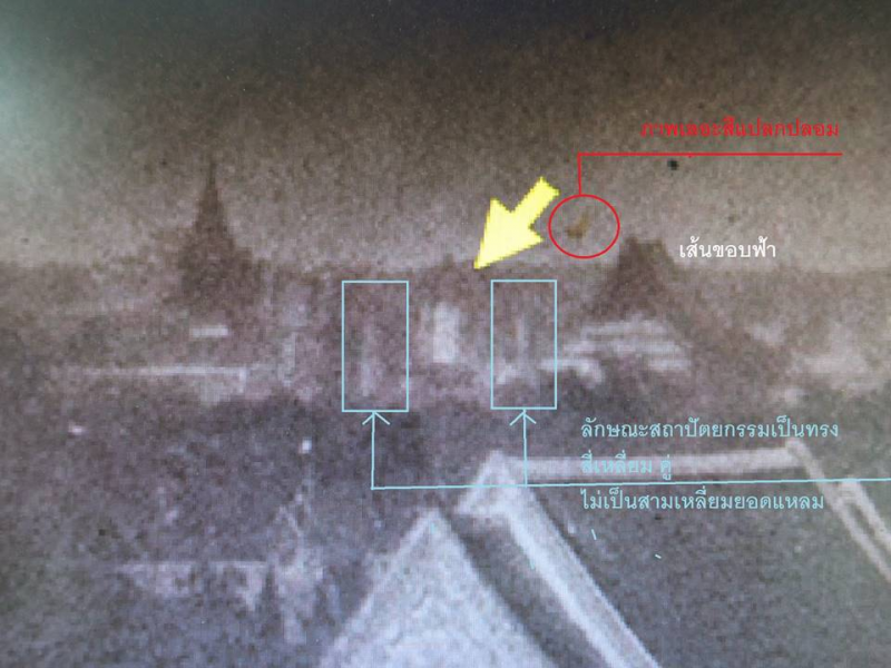 นี่ผมครอบมาจากภาพที่ผมมีอยู่ ถ่ายจากภูเขาทองในมุมที่ระดับต่ำกว่าภาพของคุณสิงหเดชเล็กน้อย จะเห็นว่าจากระยะไกลขนาดนั้นกล้องคงไม่สามารถบันทึกรายละเอียดขนาดเสาธง หรือปลายแหลมของซุ้มประตูในพระบรมมหาราชวังได้