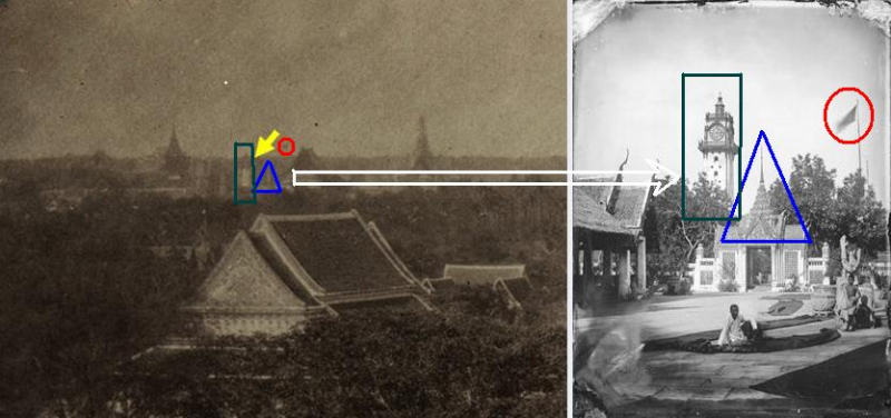 ที่ผมแปลกใจก็คือ ในภาพของท่านฟรานซิส จิตร ภาพนี้ ตรงลูกศรใช่หอนาฬิกาหรือเปล่าครับ ถ้าใช่แล้วทำไมเวลาเรามองมุมนี้จึงเห็นแค่ยอดโผล่มานิดเดียวเองล่ะครับ