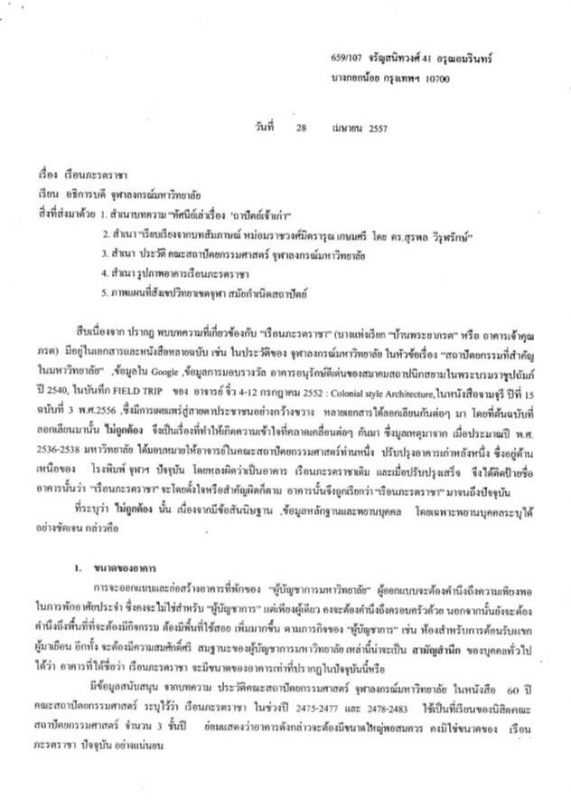 เรื่อง เรือนภะรตราชา เรียน อธิการบดี จุฬาลงกรณ์มหาวิทยาลัย สิ่งที่ส่งมาด้วย 1. สำเนาบทความ “ทัศนีย์เล่าเรื่อง ‘ถาปัตย์เจ้าเก่า” 2. สำเนา “เรียบเรียงจากบทสัมภาษณ์ หม่อมราชวงศ์มิตรารุณ เกษมศรี โดย ดร. สุรพล วิรุฬรักษ์” 3. สำเนาประวัติคณะสถาปัตยกรรมศาสตร์ จุฬาลงกรณ์มหาวิทยาลัย 4. สำเนารูปภาพอาคารเรือนภะรตราชา 5. ภาพแผนที่สังเขปวิทยาเขตจุฬาฯ สมัยกำเนิดสถาปัตย์ สืบเนื่องจากปรากฏพบบทความที่เกี่ยวข้องกับ “เรือนภะรตราชา” (บางแห่งเรียก “บ้านพระยาภรต” หรือ อาคารเจ้าคุณภรต) มีอยู่ในเอกสารและหนังสือหลายฉบับ เช่น ในประวัติของจุฬาลงกรณ์มหาวิทยาลัยในหัวข้อเรื่อง “สถาปัตยกรรมที่สำคัญในมหาวิทยาลัย”, ข้อมูลใน Google, ข้อมูลการมอบรางวัล อาคารอนุรักษ์ดีเด่นของสมาคมสถาปนิกสยามในพระบรมราชูปถัมภ์ ปี 2540 , ในบันทึก FIELD TRIP ของอาจารย์จิ๋ว 4-12 กรกฎาคม 2552 : Colonial style Architecture, ในหนังสือจามจรีปีที่ 15 ฉบับที่ 3 พ.ศ. 2556 ซึ่งมีการเผยแพร่สู่สายตาประชาชนอย่างกว้างขวาง หลายเอกสารได้ลอกเลียนกันต่อๆมา โดยที่ต้นฉบับที่ลอกเลียนมานั้น ไม่ถูกต้อง จึงเป็นเรื่องที่ทำให้เกิดความเข้าใจที่คลาดเคลื่อนต่อๆกันมา ซึ่งมูลเหตุมาจาก เมื่อประมาณปี พ.ศ. 2536-2538 มหาวิทยาลัยได้มอบหมายให้อาจารย์ในคณะสถาปัตยกรรมศาสตร์ท่านหนึ่งปรับปรุงอาคารเก่าหลังหนึ่ง ซึ่งอยู่ด้านเหนือของโรงพิมพ์จุฬาฯ ปัจจุบันโดยหลงผิดว่าเป็นอาคารเรือนภะรตราชาเดิม และเมื่อปรับปรุงเสร็จ จึงได้ติดป้ายชื่ออาคารนั้นว่า “เรือนภะรตราชา” จะโดยตั้งใจหรือสำคัญผิดก็ตาม อาคารนั้นจึงถูกเรียกว่า “เรือนภะรตราชา” มาจนถึงปัจจุบัน