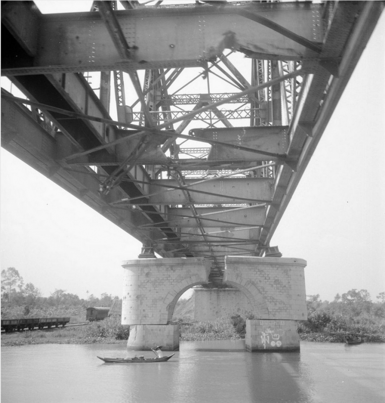 ภาพเมื่อโดนระเบิดแล้ว สะพานขาดกลาง ตอม่อแยกจากกัน คานเหล็กขวางยังขาดจากกัน