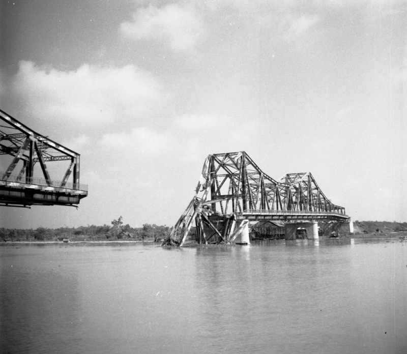 ภาพเมื่อโดนระเบิดแล้ว สะพานขาดกลาง ตอม่อแยกจากกัน คานเหล็กขวางยังขาดจากกัน
