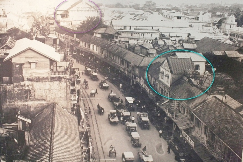 ด้านบนของภาพจะเห็นถนนเยาวพานิชด้านขวาที่มีบ้านสูง