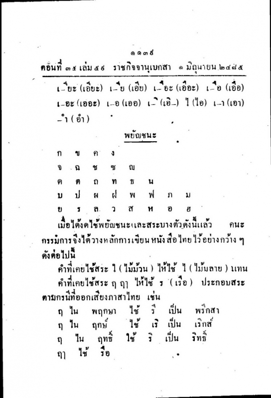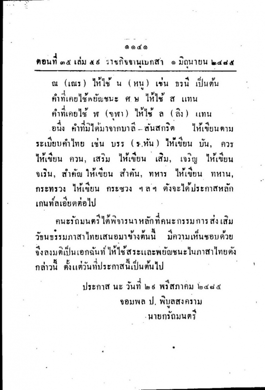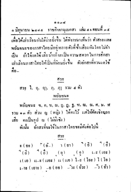 ประกาศราชกิจจานุเบกษาเรื่องการเปลี่ยนแปลงการเขียนอักษรไทยให้มีความง่าย เพื่อที่ต้องการจะเผยแพร่อักษรไทยสู่เยาวชน ในปี 2485