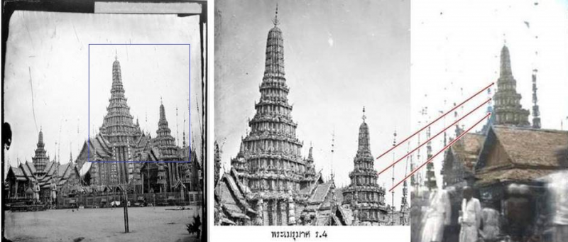จากภาพเมรุทิศที่อยู่ท้ายสุด ผมได้ตัดขยายขึ้น แล้วกลับซ้ายเป็นขวา นำไปเทียบกับที่ตัดขยายจากภาพของคุณหนุ่ม ภาพปริศนาก็สิ้นปริศนานับแต่นั้น(ภาพก่อนหน้าโน้น) และเป็นคำตอบด้วยว่า ทำไมจึงไม่ปรากฏภาพสถาปัตยกรรมอื่นๆต่อจากนั้น เพราะมันสุดมุมแล้วนั่นเอง