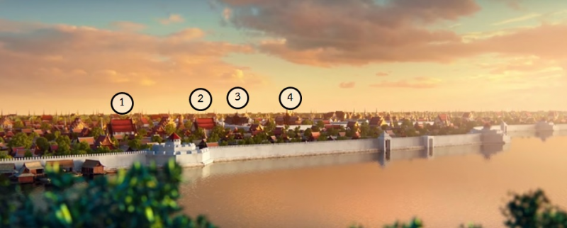 1= วัดหน้าพระเมรุ  2= พระที่นั่งสุริยาศน์อมรินทร์  3= พระที่นั่งสรรเพชญ  4= พระที่นั่งวิหารสมเด็จ