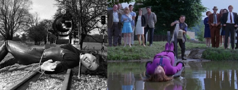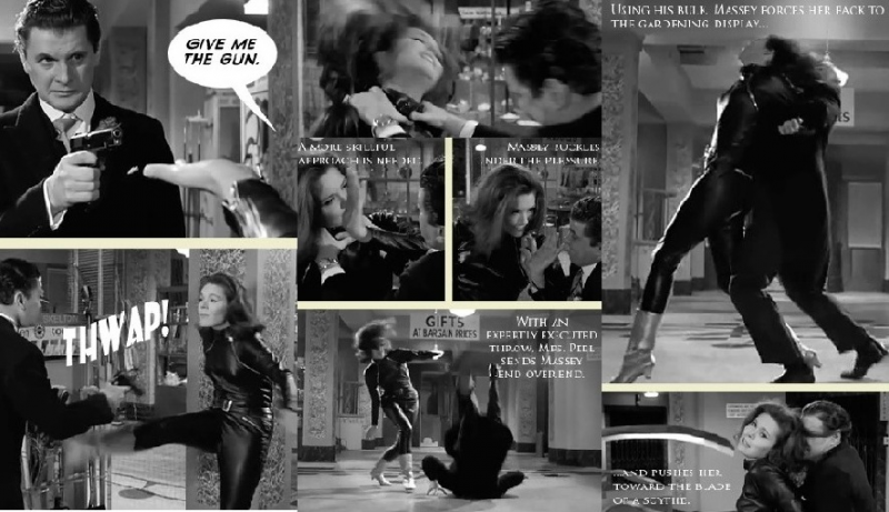 ในขณะที่คุณสตี๊ดมีบทแอ็คชั่นเบาๆ ใช้ร่มและหมวกเป็นอาวุธจัดการคนร้ายได้ง่ายดาย ตรงกันข้าม คุณนายพีลต้องออกแรงแสดงศิลปะป้องกันตัวเตะต่อยคู่ต่อสู้ที่เป็นชายตัวใหญ่กว่า รวมทั้งบทถูกจับมัดทรมาน