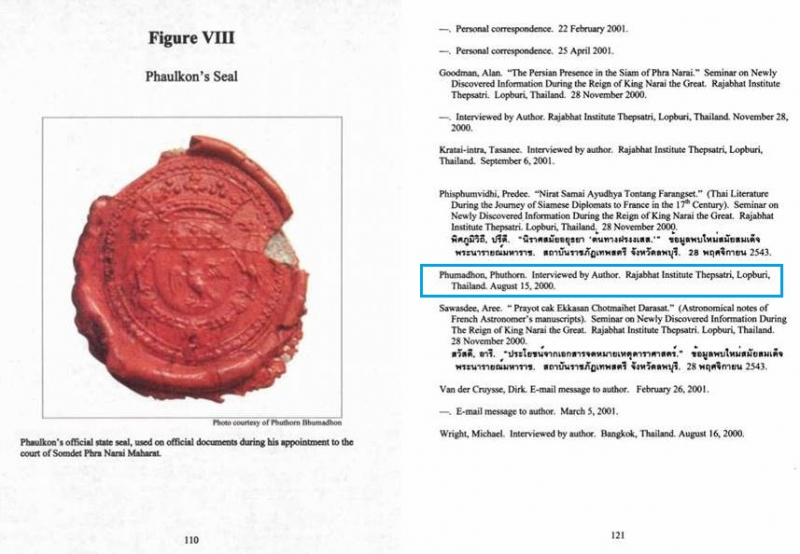 Phaulkon : The Greek First Counsellor at the court of Siam : An Appraisal  ตีพิมพ์โดยสยามสมาคม เมื่อ ค.ศ. 1998 เขียนโดย ดร.จอร์จ เอ. ซิโอริส (George A. Sioris) อดีตเอกอัครราชทูตกรีซประจำประเทศไทยและอีกหลายๆ ประเทศครับ หลังจากเกษียณแล้วท่านได้มาอาศัยอยู่ที่เชียงใหม่ แต่ท่านจะนำภาพตรานี้มาจากที่ใด ไม่ชัดเจนครับ