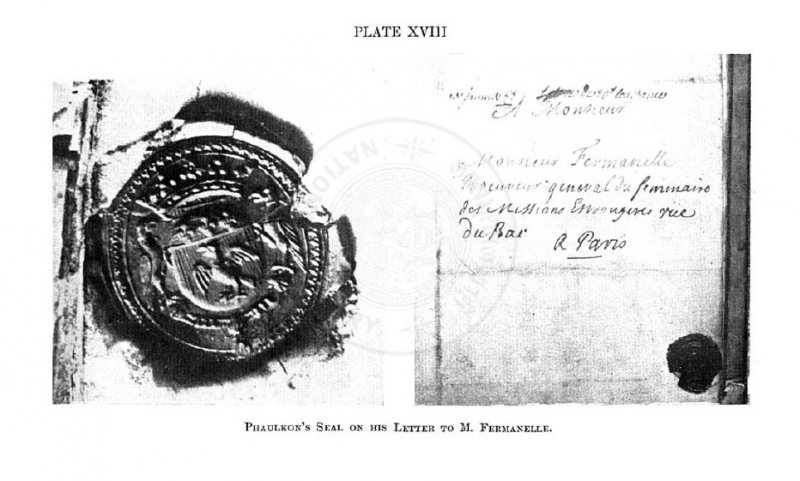 ตราประทับแบบไทยของฟอลคอนในจดหมายที่ฟอลคอนส่งให้นักเรียนไทยไทยในปารีส เขียนที่เมืองละโว้ ลงวันที่ 6 ธันวาคม 1686 ต้นฉบับเก็บรักษาอยู่ที่หอจดหมายเหตุคณะมิสซังต่างประเทศแห่งปารีส (Missions étrangères de Paris) เอกสาร Vol. 854, No. 773 ตีพิมพ์ในหนังสือ Adventures in Siam in the Seventeenth Century ของ E. W. Hutchinson
