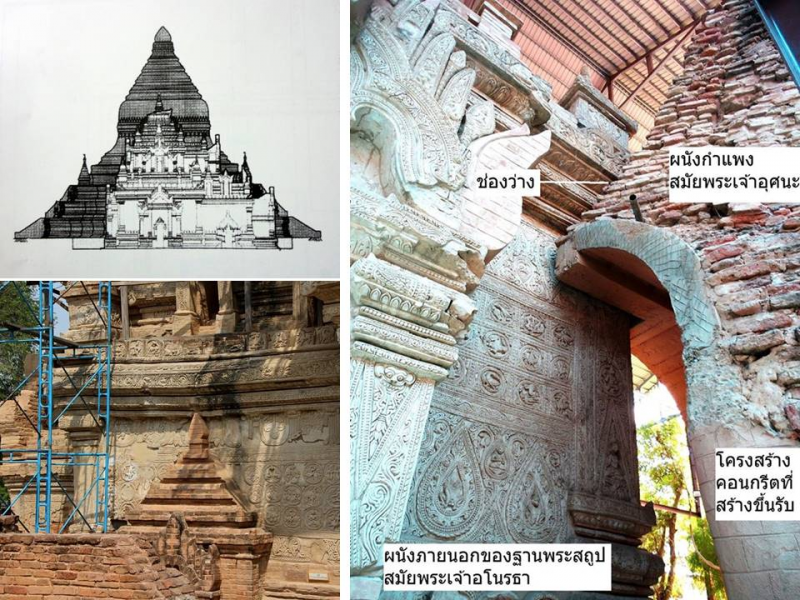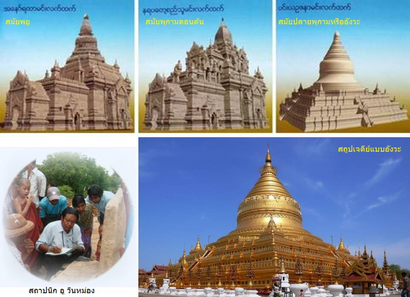 " โบราณสถานแห่งนี้ไม่มีที่ใดในโลกจะเหมือนครับ เป็นการสร้างพระสถูปเจดีย์สามยุค สามสมัย สร้างทับซ้อนกัน โดยไม่ทำให้คุณค่าสถาปัตยกรรมยุคก่อนหน้า เสียหาย เป็นความชาญฉลาดของสถาปนิกนักอนุรักษ์นิยมในสมัยโบราณที่ให้เกียรติแก่กันและกัน โดยเฉพาะพระสถูปยุคใหม่สุดที่อยู่ผิวนอกสุด เป็นสมัยพุกามยุคปลายคาบเกี่ยวกับสมัยอังวะ สร้างหลังสุดเมื่อสี่ห้าร้อยปี ที่ผ่านมานั้น ได้สร้างครอบเจดีย์พุกามยุคต้นอายุร่วมพันปีองค์อยู่ข้างในตรงกลาง ที่สร้างก่อนหน้า สร้างซ้อนกันแต่ไม่แตะต้องกัน โดยเอาฝุ่นดินหนา ๔๐ ซม.บ้าง ๘๐ซม.บ้าง พอกใว้ระหว่างผิวนอกของเจดีย์องค์ใน เพื่ออนุรักษ์ปูนปั้นลวดลายยุคต้นอันวิเศษยี่งสมัยพุกามใว้ใด้เกือบ๑๐๐% แล้วจึงสร้างองค์ใหม่อยู่ด้านนอก.