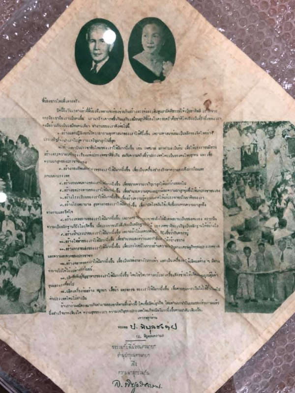 อีกเวอร์ชั่นหนึ่ง แถลงนโยบายบนผ้าเช็ดหน้า ห้อยท้ายด้วยการหาเสียงเป็นผู้แทนจังหวัดนครนายกของท่านผู้หญิงละเอียด พิบูลสงคราม  ยิงฟันยิ้ม