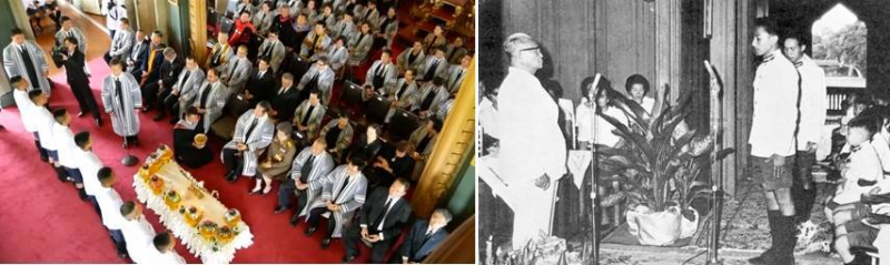 ในภาพคือพิธีแต่งตั้งหัวหน้าคณะบนหอประชุมอันศักดิ์สิทธิ์ หลังพิธีไหว้ครูประจำปี รูปแบบของพิธีกรรมสมัยนี้กับสมัยผมต่างกันไปบ้าง ที่เหมือนเดิมคือ หัวหน้าทุกคนจะต้องกล่าวคำปฏิญาณตนต่อหน้าพระบรมฉายาลักษณ์ในเรื่องของปฏิบัติหน้าที่