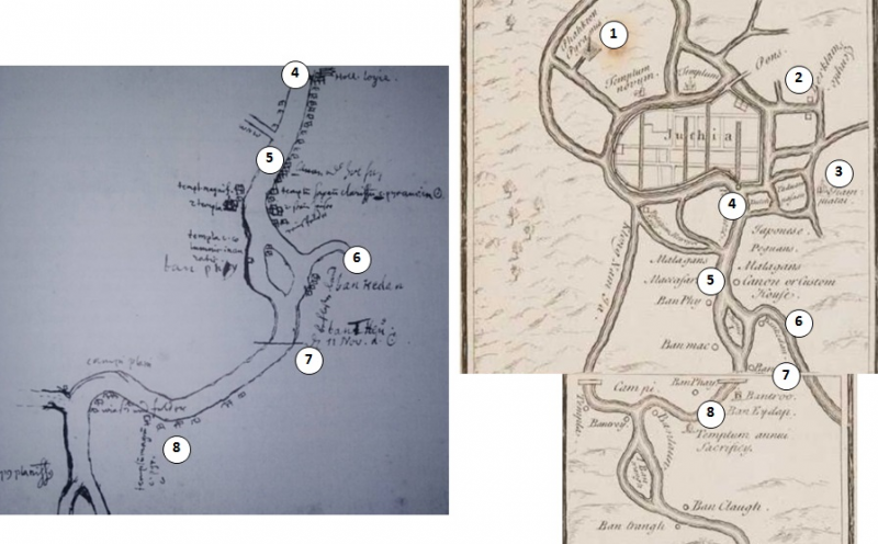 มีตำแหน่งของสถานที่น่าสนใจที่แกมป์เฟอร์บันทึกไว้ 1. วัดภูเขาทอง (Phahkton temple) 2. วัดพระคลัง (Berklam temple) + วัดเดิม 3. วัดเจ้าพญาไทย (Tiampiatai) 4. บ้านฮอลันดา (Holl.) ุ 5. ขนอนภาษี (Canon custom house) ุ 6. บางขดาน (Ban Kedan) 7. บางปะอิน (Ban Tten ?) 8. วัดสำหรับพระราชพิธีประจำปี (Templum annui sacrifiey)