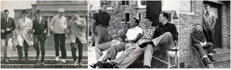 ส่วนแฟชั่นผู้ชายในยุค 1950s เป็นแบบข้างล่างนี้ค่ะ ซ้ายสุด คือเสื้อผ้าชุดไปทำงาน หรือไปธุระปะปังนอกบ้าน เว้นแต่คนที่สองจากขวา ค่อนข้างลำลอง ตรงกลาง คือเสื้อผ้าแบบสบายๆ สวมในฤดูร้อน ขวาสุด สไตล์แต่งตัวของวัยรุ่นประเภทเฮ้วสุด