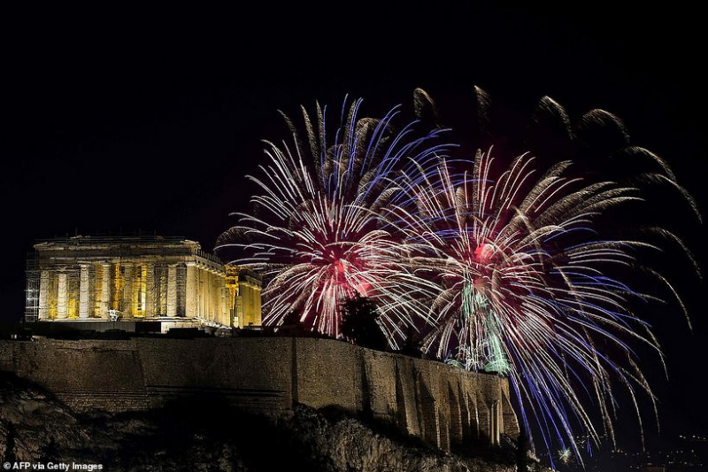 Greece พลุส่องแสงเคียง วิหาร Parthenon ซึ่งตั้งอยู่บนเนินเขา Acropolis ในกรุง Athens