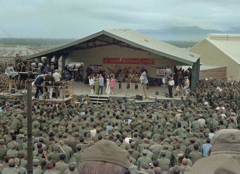 ย้อนอดีตสมัยสงครามเวียตนาม นักแสดงตลกในตำนาน Bob Hope นำศิลปินไปปลอบขวัญ ทหารเมกัน ในภาพเป็นที่ Da Nang, the Bob Hope Christmas show. On stage with Bob is Raquel Welsh, Miss World from Peru and Anita Bryant. (Date: December 18, 1967)