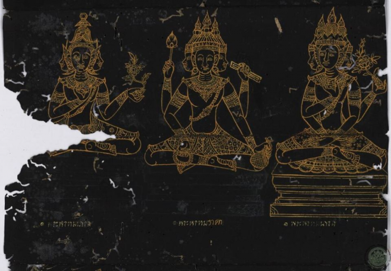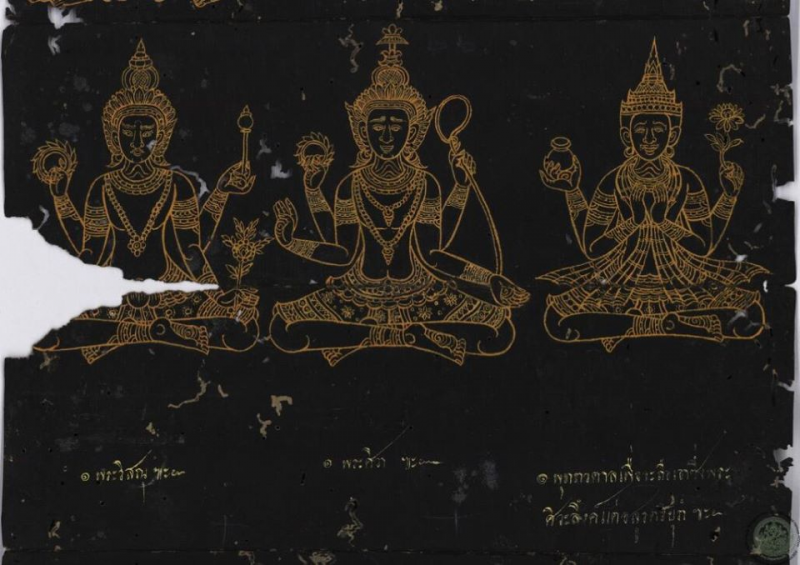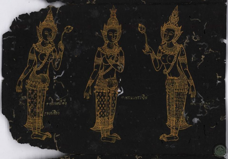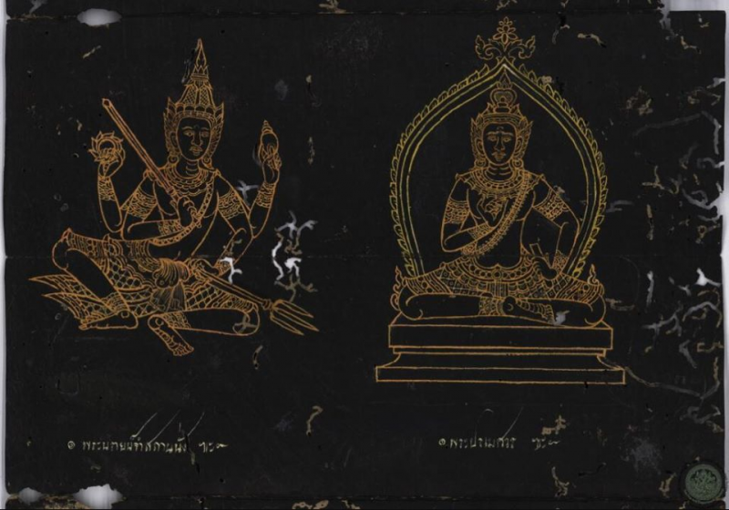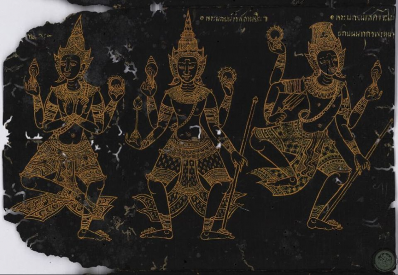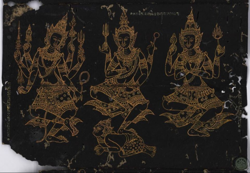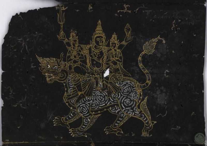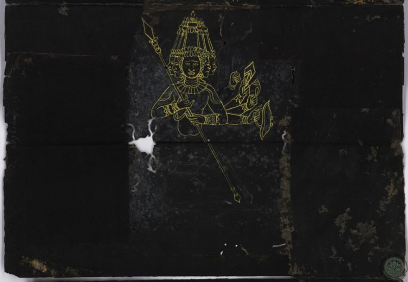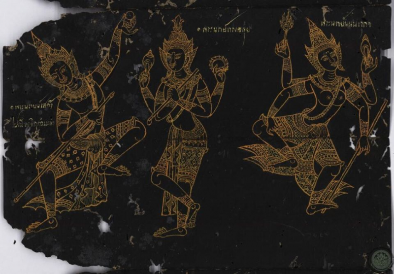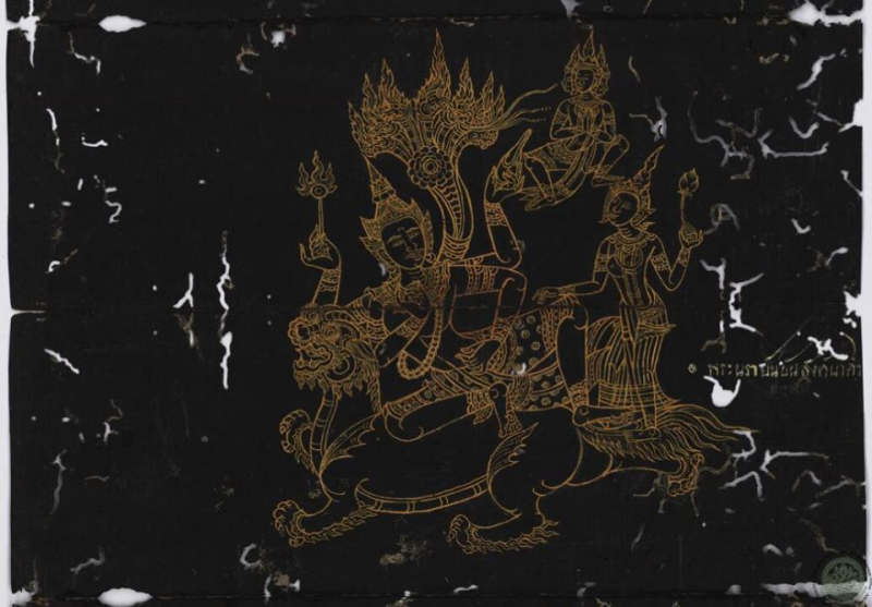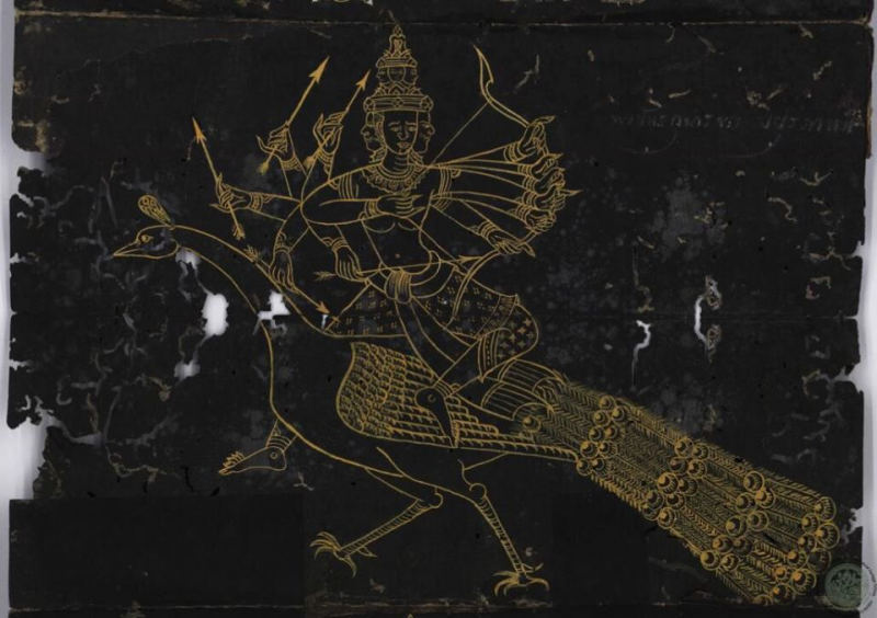 ภาพยังวาดไม่เสร็จ ไม่มีข้อความระบุกำกับว่าคือเทพองค์ใด แต่มีความคล้ายคลึงกับรูปพระขันทกุมารทรงนกยูงบนบานหน้าต่างของพระอุโบสถ วัดบวรสถานสุทธาวาส (วัดพระแก้ววังหน้า) รูปนี้อาจเป็นรูปพระขันทกุมารต้นแบบ