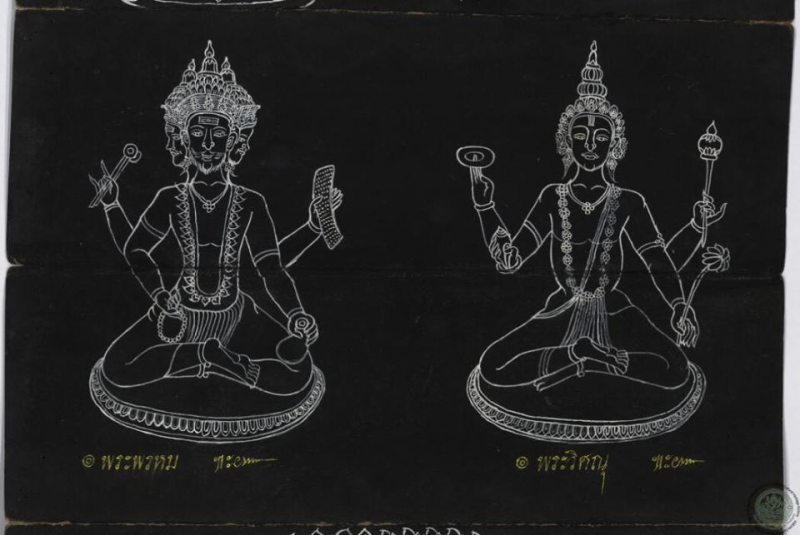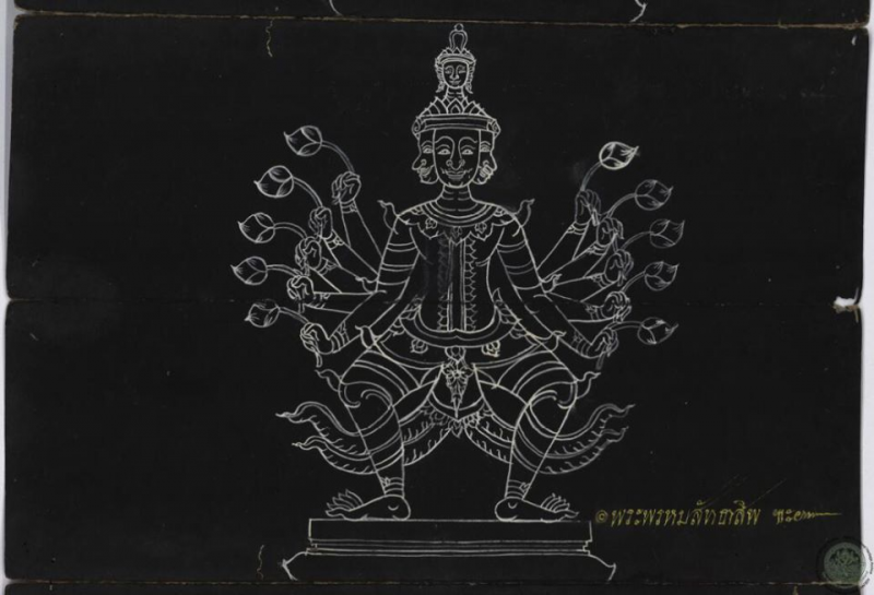 ในไตรภูมิฉบับหอสมุดแห่งชาติกรุงปารีส กล่าวว่าพระพรหมบรมสุกขพิจิตรมหาพรหม (มหาพรหมเทพราช) ทอดเลข ๑ เป็นพระอิศวร มีกายสีขาว หัวทรงชฎาธาร มี ๓ ตา (ตาที่ ๓ มีชื่อว่า เพศสังหาร เมื่อเปิดออกแล้วจะลุกเป็นไฟไหม้ ๓ โลก) สวมสังวาลนาค ทรงอาภรณ์หนังเสือ กรทรงคัมภีร์สีทองดำถมอและแก้วสัพพพิธรัตนะสลัก ซึ่งตรงกับภาพนี้