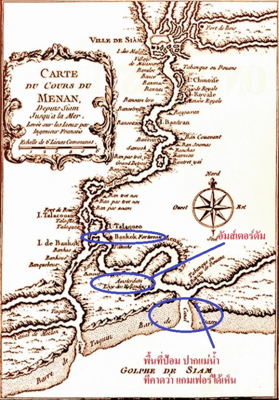 On the sixth of July we arrived at Bankok in the morning, having advanced but little all night, by reason of the difficulties we had to struggle with. We found the old Fort, which lies on an Island, in good condition; but the new Fort, that had been built by the French on the East shore, was quite demolish'd. Before evening we reached the Dutch Habitation and Store-house called Amsterdam. Amsterdam, which is but two Leagues distant from the Sea. สรุปคร่าวๆได้ความว่า แกมป์เฟอร์ลงเรือเล็กออกมาจากกรุงศรีอยุธยาเมื่อวันที่ 4 กรกฎาคม 1690 เพื่อไปยังเรือใหญ่ที่จอดทอดสมออยู่ที่ปากแม่น้ำเจ้าพระยา วันที่ 6 ก็มาถึงบางกอก แล้วไปถึงอัมสเตอดัม ซึ่งก็คือเมืองปากน้ำนั่นเองครับ