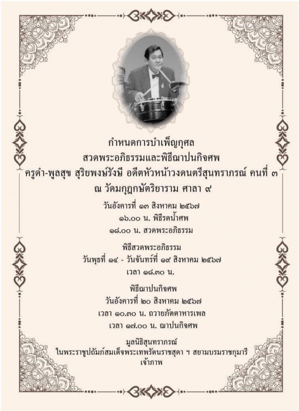 มูลนิธิสุนทราภรณ์ ในพระราชูปภัมภ์สมเด็จพระเทพรัตนราชสุดา ฯ สยามบรมราชกุมารี ขอแจ้งข่าวการเสียชีวิตของครูดำ-พูลสุข สุริยพงษ์รังษี หัวหน้าวงดนตรีสุนทราภรณ์ ลำดับที่ 3 (ต่อจากครูเอื้อ สุนทรสนาน และครูสริ ยงยุทธ) โดยครูดำเสียชีวิตด้วยอาการหัวใจล้มเหลว เมื่อเวลา 00.30 น. ของวันที่ 12 สิงหาคม 2567 ที่ผ่านมา สิริรวมอายุ 79 ปี