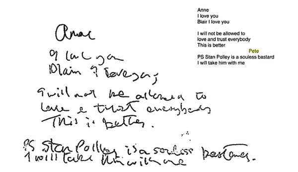 "Anne, I love you. Blair, I love you. I will not be allowed to love and trust everybody. This is better. Pete. P.S. Stan Polley is a soulless bastard. I will take him with me".