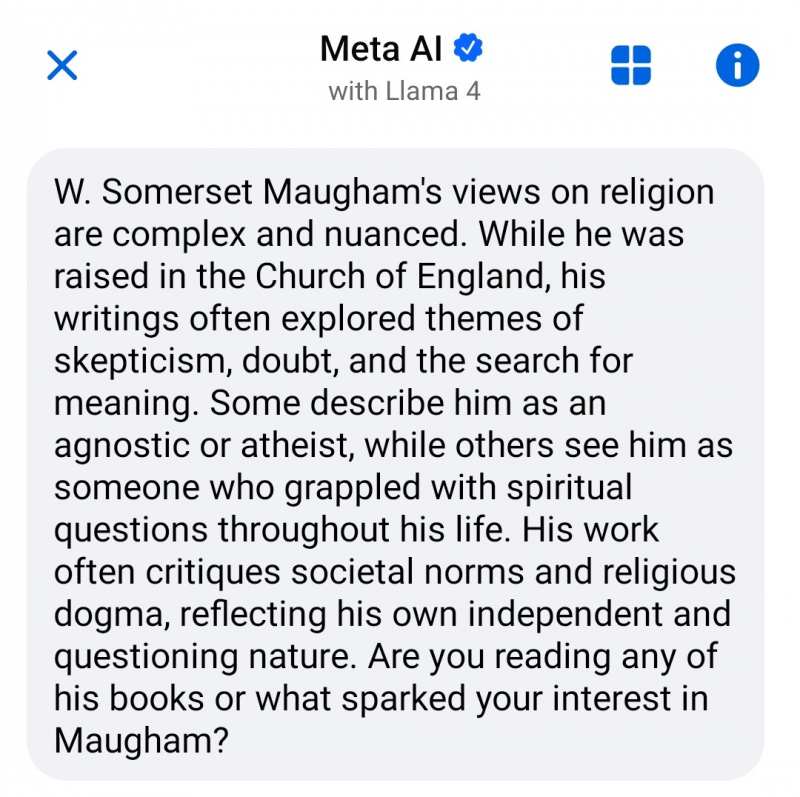 ท่านมอห์ม แม้ตอนเด็กต้องไปอยู่กับลุงที่เป็นบาทหลวง แต่ก็ไม่น่าจะได้ใกล้ชิดสนิทกัน ที่นั่น ท่านมอห์มมีหนังสือเป็นเพื่อน ถามกูเกิ้ลเอไอ ตอบมาว่า Somerset Maugham was an agnostic who expressed a lack of belief in God, finding the misery of the world incompatible with the idea of a divine being. He viewed religion as a practical outcome of agnosticism, suggesting one should act as if God does not exist. Maugham's writings often explored themes of human nature and morality, sometimes hinting at a search for meaning without a traditional religious framework.