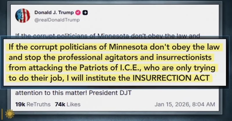 สิ่งที่ทรัมป์ทำจึงไม่สามารถจะมองเป็นอื่นได้เลยนอกจากการสร้างสถานการณ์ยั่วยุให้คนท้องถิ่นโกรธ เพื่อที่เขาจะได้ใช้เป็นข้ออ้างในการประกาศใช้พรบ.ฉุกเฉิน Insurrection Act และส่งกำลังทหารพร้อมอาวุธเข้าไปปราบปรามผู้ประท้วง จุดประสงค์เดียวที่ทรัมป์มีไม่ใช่เพื่อกวาดล้างคอร์รัปชั่นในหมู่ผู้อพยพจากโซมาเลียอย่างที่กล่าวอ้าง แต่คือการขยายขอบเขตอำนาจของปธน.ให้เกินกว่าที่รัฐธรรมนูญกำหนดให้ เพื่อสร้างความยิ่งใหญ่ให้แก่ตัวเองและตอบแทนศัตรูทางการเมืองอย่างสาสม